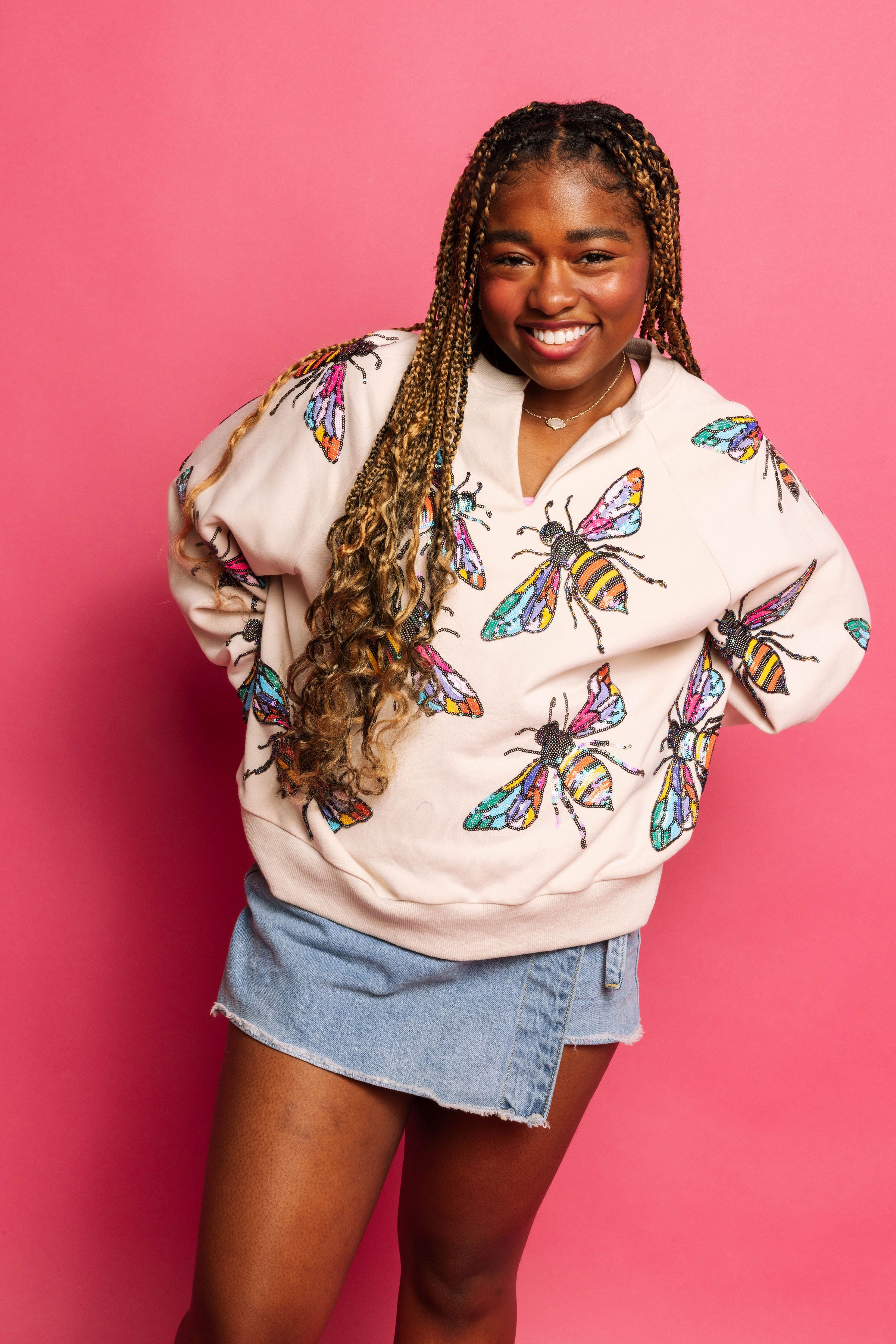 Go to the shopBee wings beat at an impressive 230 beats per second, but that's not as impressive as this outfit. Get ready to fly high in style with our Queen of Sparkles Beige Multi Bumble Bee Swetshirt. Matching shorts available.