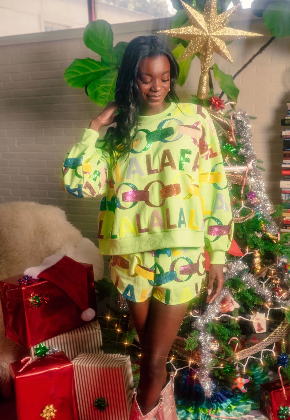 Go to the shopQueen of Sparkles Green FALAFLA sweatshirt. Featuring a sequin Christmas tree garland design and of course falafla. This sweatshirt will add a touch of holiday spirit to any outfit. Matching shorts available.