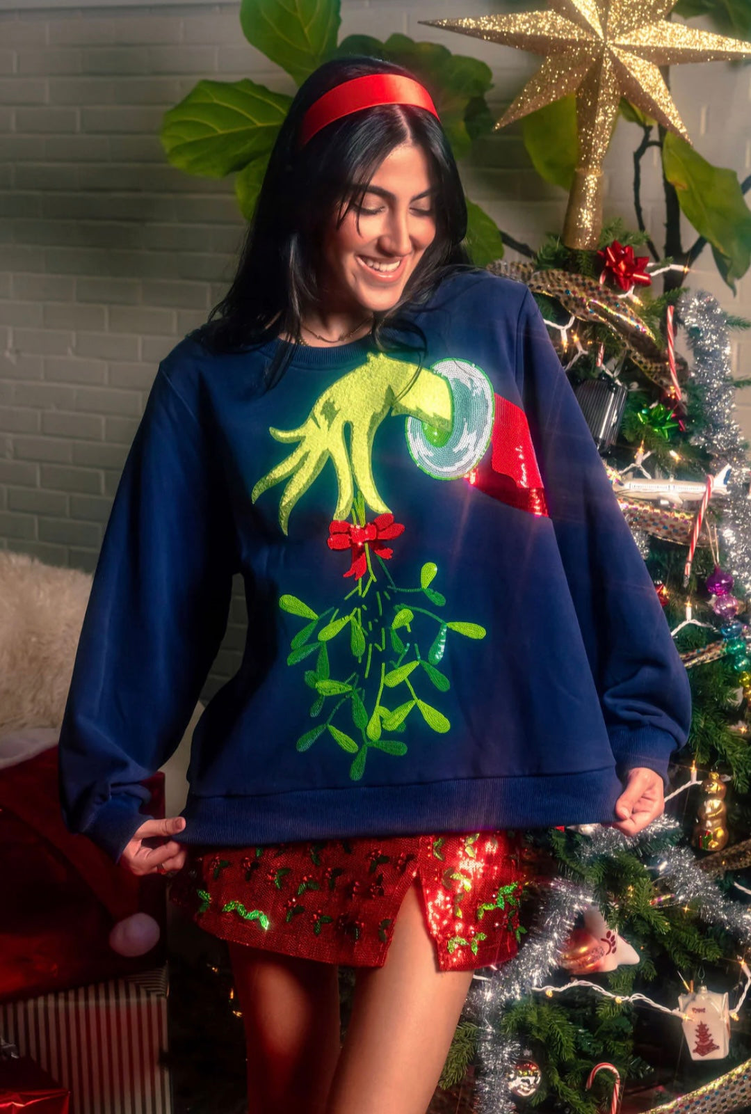 Go to the shopElevate it with the Queen of Sparkles Navy Grinch Mistletoe Toe Hand Sweatshirt. This sweatshirt is perfect for spreading holiday cheer. Stay warm and stylish in this must-have piece.