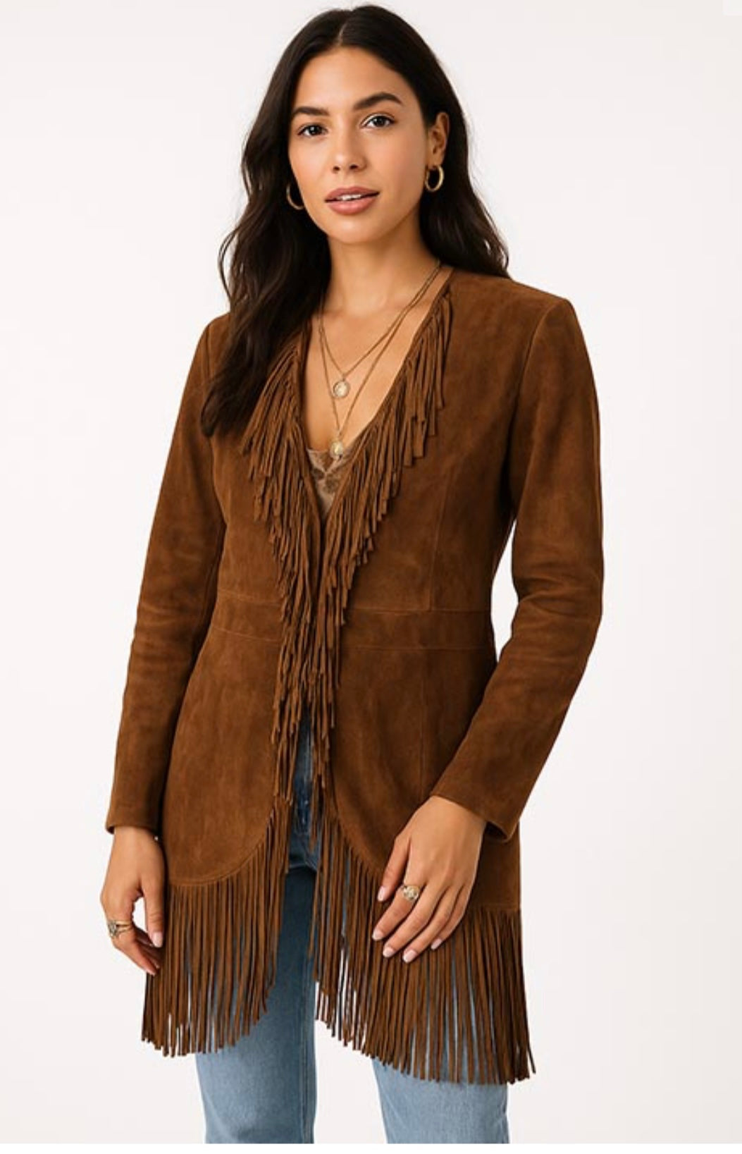 Go to the shopThis coat is made of rich soft boar suede. Fringe cascades starting with the collar, down the front and around the hem. T
