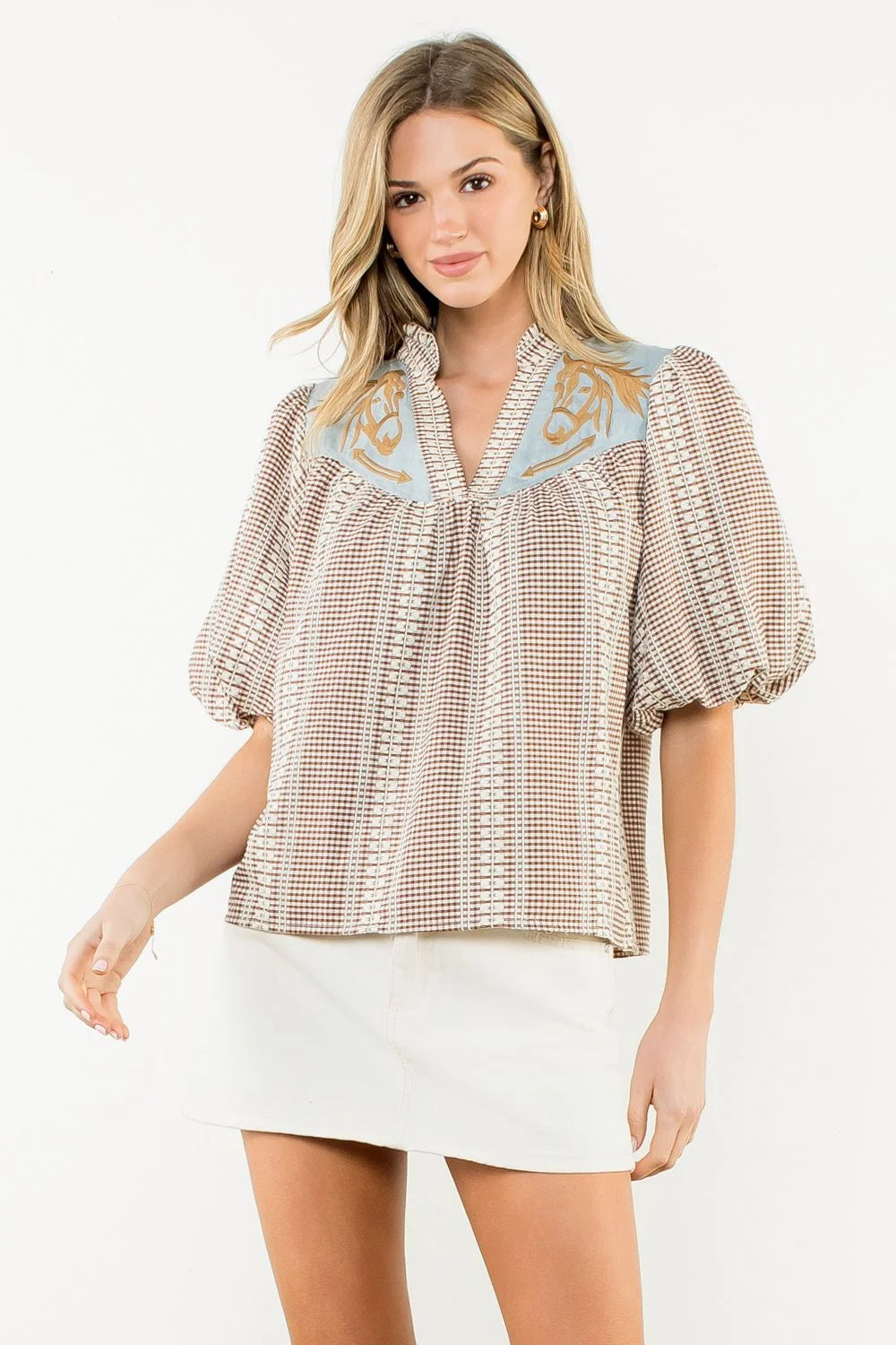 Go to the shopThis Brown Gingham Horse Embroidered detailed embroidery features a darker tone than shown in photo. Western is all the rage. This is a safe piece to start your collection. THML