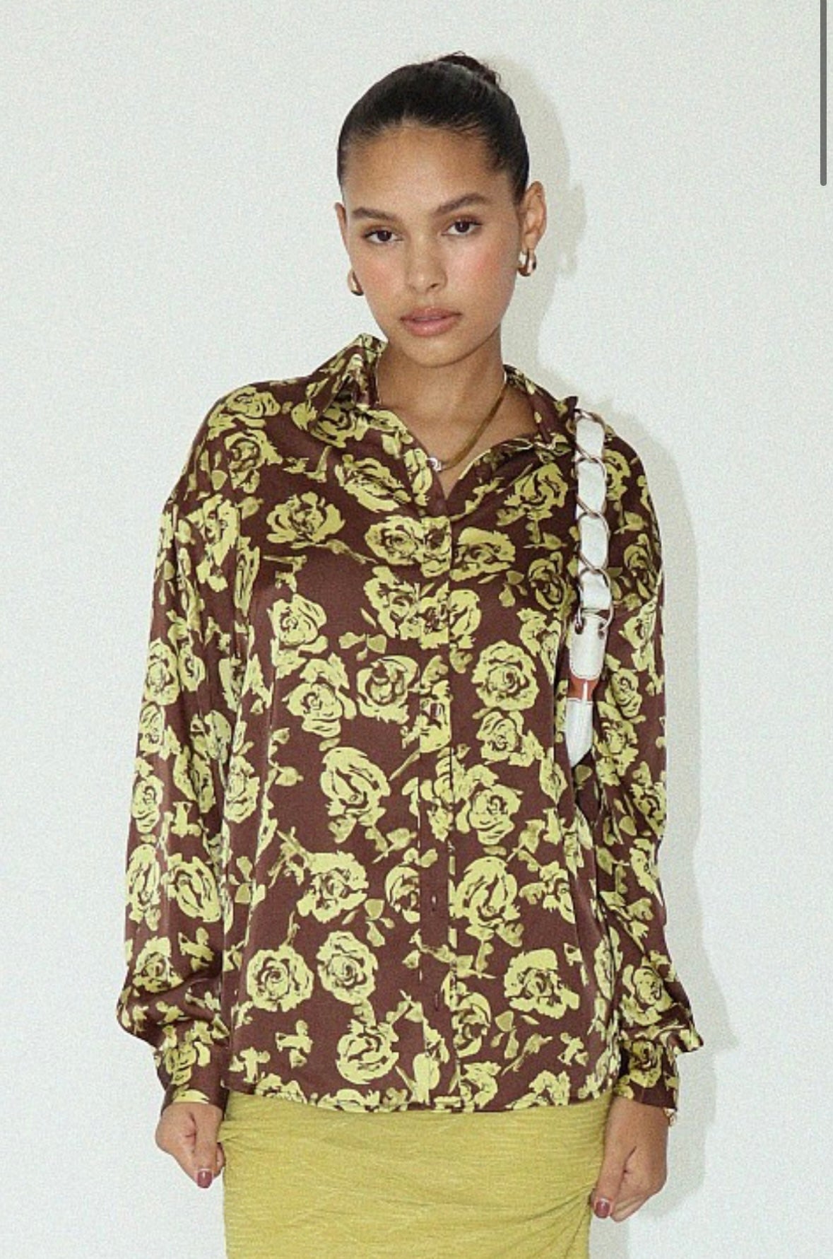 Go to the shopThis brown satin blouse is adorned with bright lime green yellow roses, creating a stunning contrast. 100% polyester