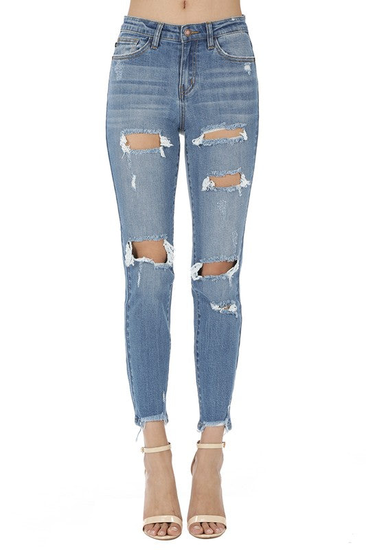 Our Distressed Girlfriend Jeans are made of stretch cotton-blend denim.  This distressed pair is designed for a lived-in look. They sit at the waist and are straight through hips and thighs. They are not your mom's jeans...they are for you girlfriend!