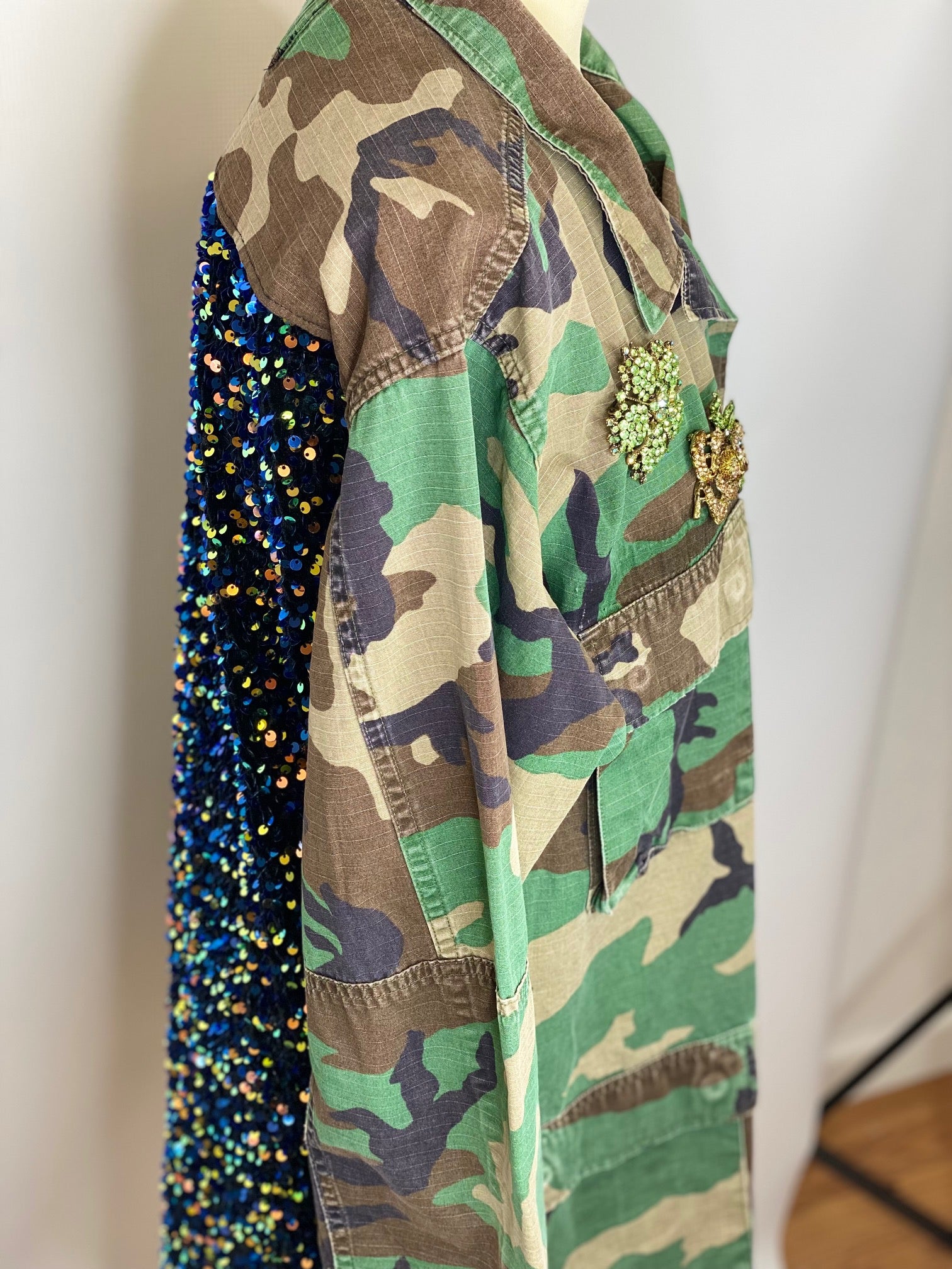 Go to the shopOne-of-a-kind camo jacket with a nod to the solider who wore it. This jacket is complimented with sequin stretch velvet fabric.