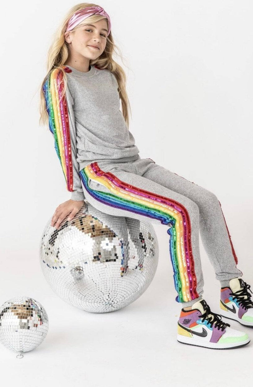 Go to the shopUpgrade your little one's wardrobe with our Grey Rainbow Track Suit. Made with a stylish sequin design, this track suit adds a touch of glitz and glamour to their everyday wear.