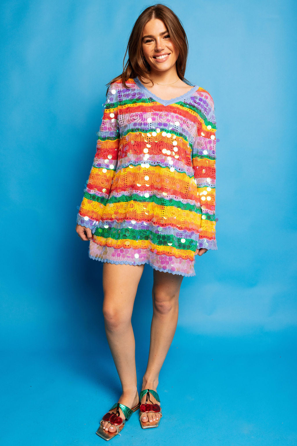 Go to the shopVacation anyone? Our Queen of Sparkles Rainbow Stripe Paillette Long Sleeve Knit Dress. This versatile piece can be worn both as a dress or bathing suit cover up, making packing a breeze.