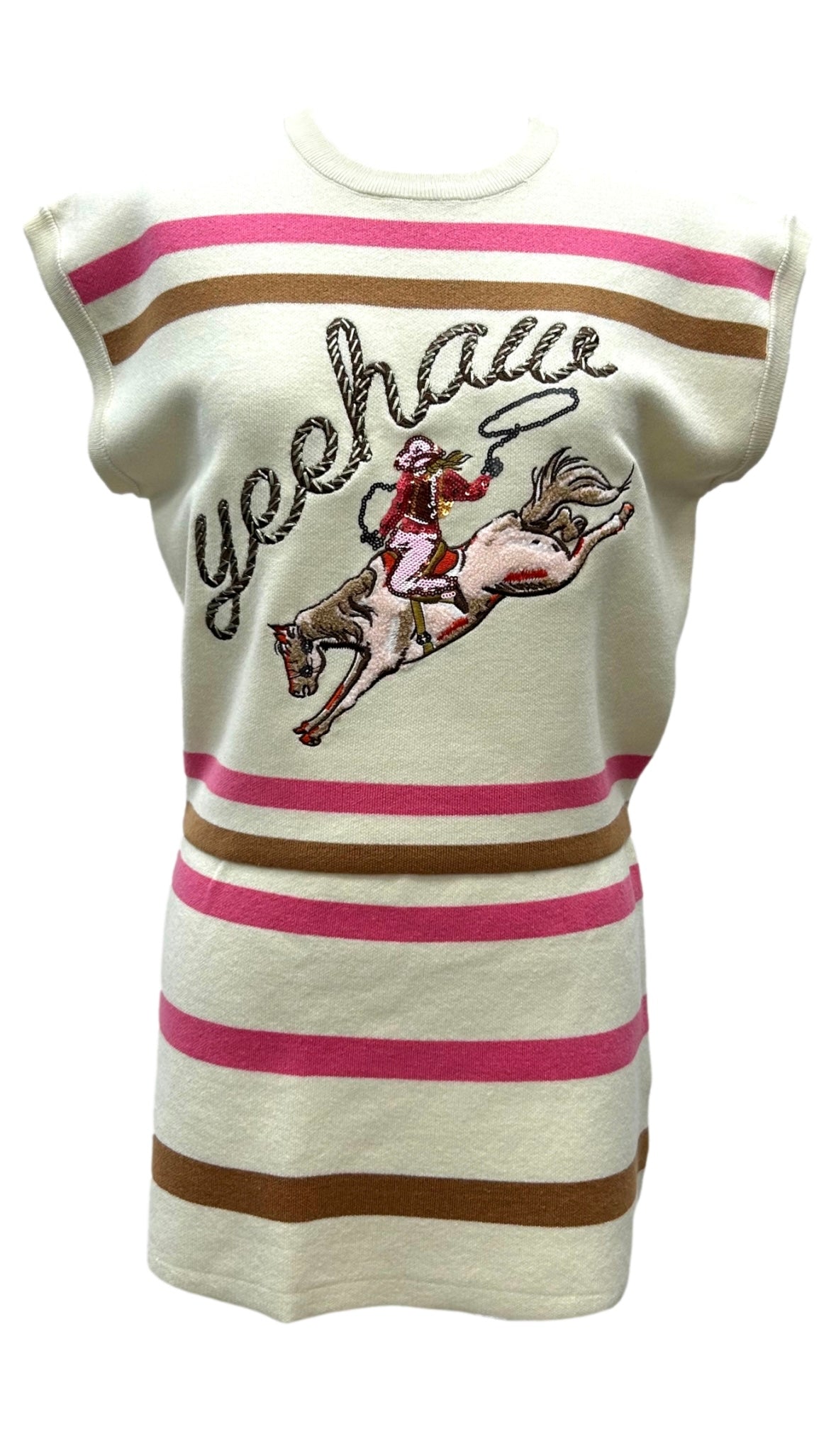 Go to the shopIntroducing the Queen of Sparkles Yeehaw Cowgirl Knit Top. With its stunning embroidery. This vintage inspired outfit is a must have piece. Paid with Santa Baby top too