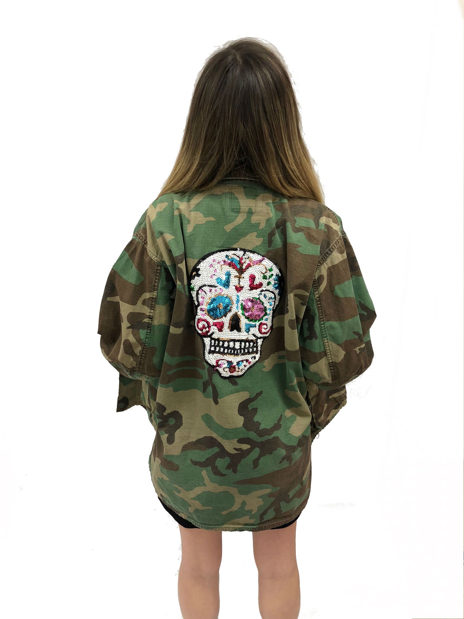 Go to the shopHey you...the one who doesn't want to look like everyone else. We can make this jacket in any size, any length, with graphic. This one is a classic sugar skull.